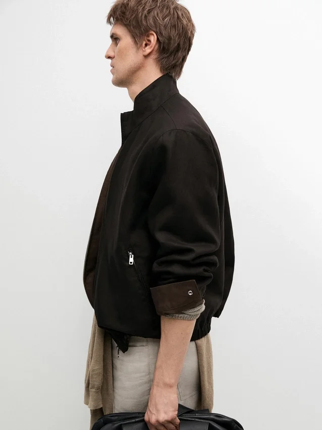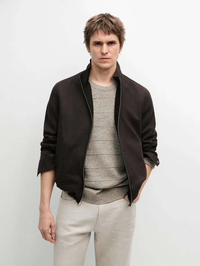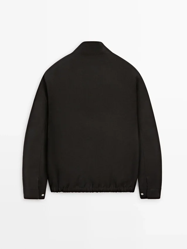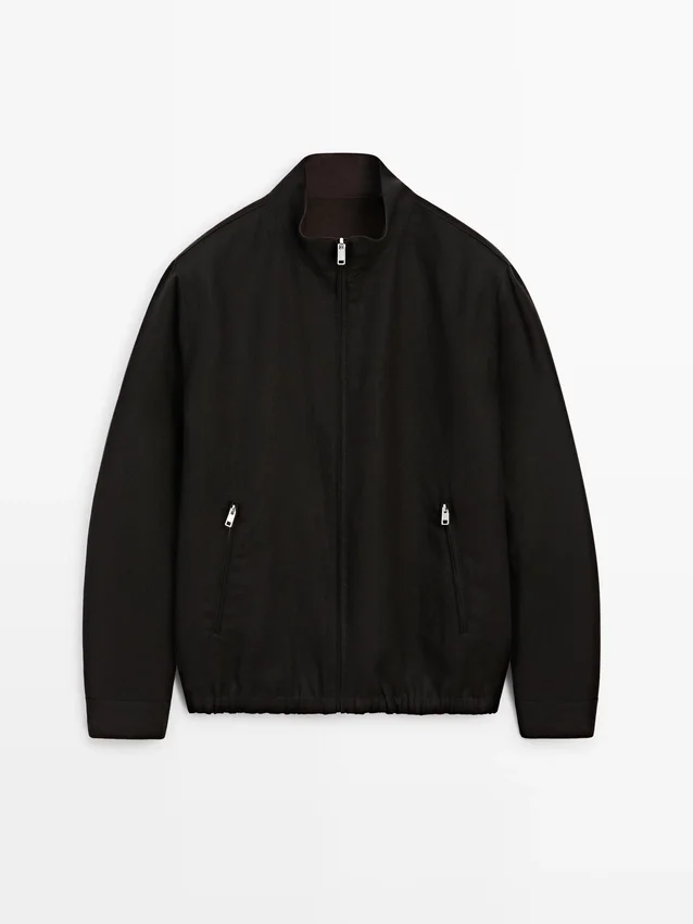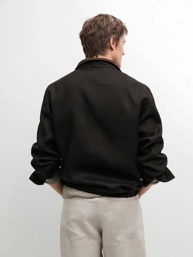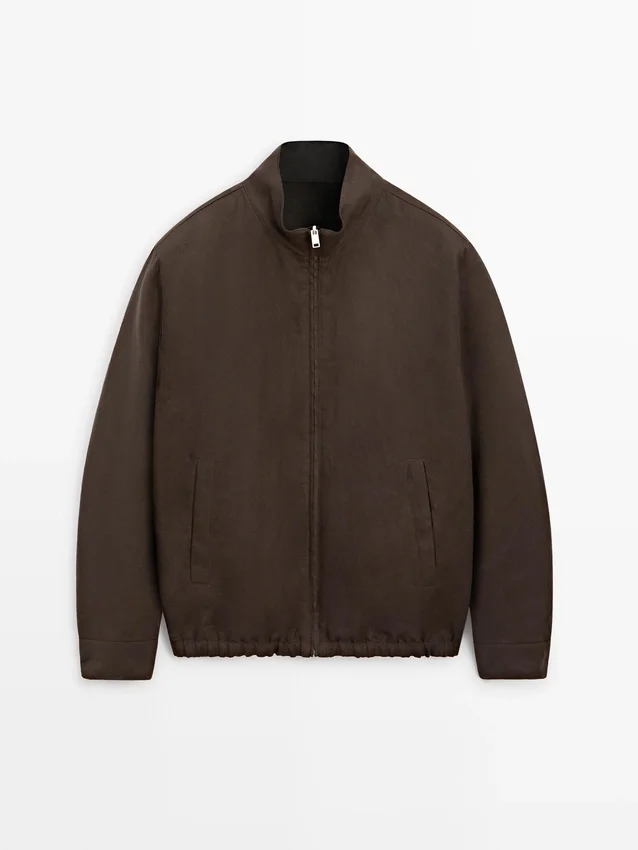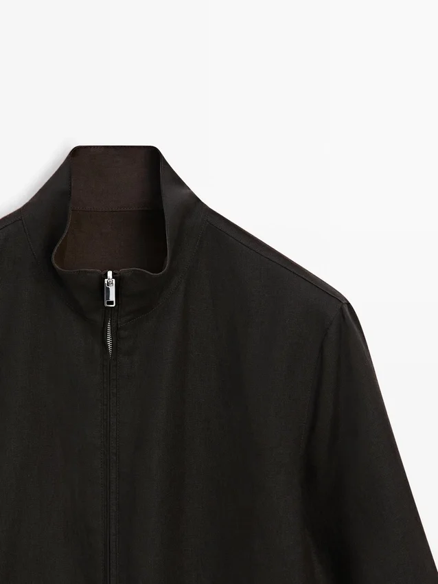 Jasje gemaakt van 100% linnen. Hoge kraag. Lange mouwen. Ritssluiting. Twee zakken met rits. Elastische band aan de zoom. Omkeerbaar kledingstuk.