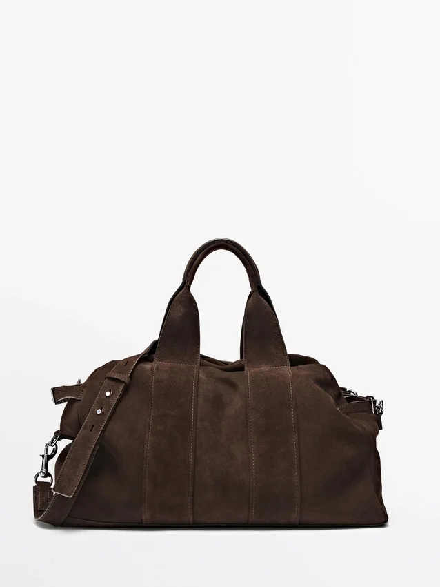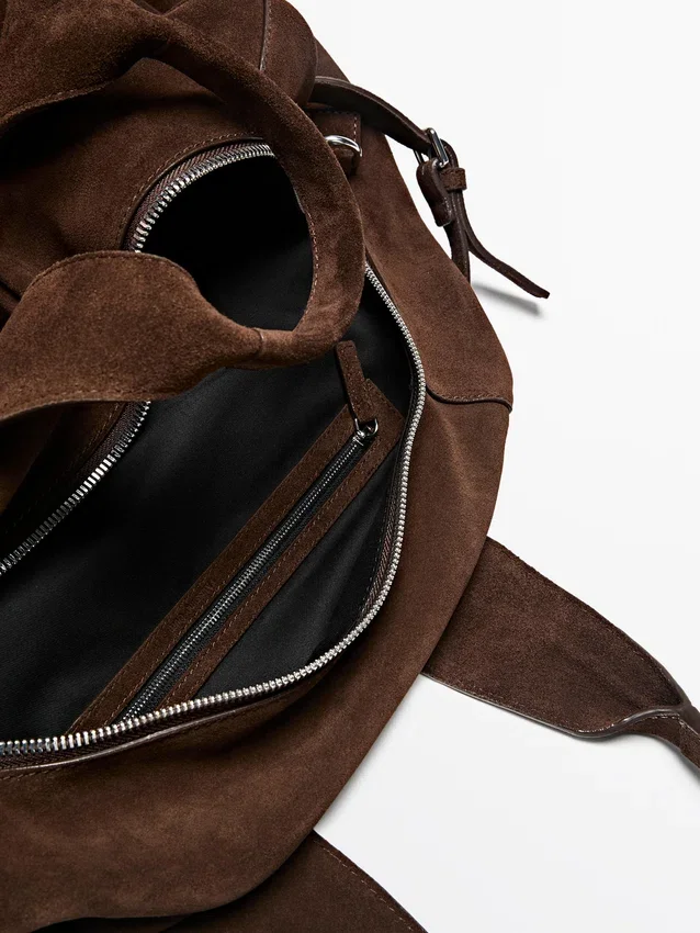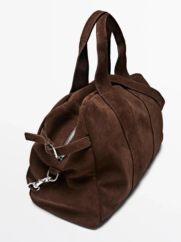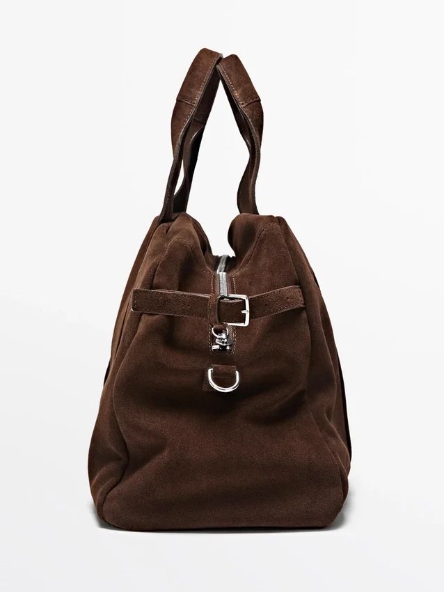 Handtas gemaakt van rundleer met suède afwerking. Ritssluiting. Twee handvatten en schouderbanden. Katoenen voering.
