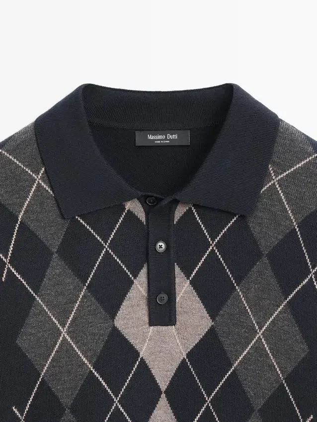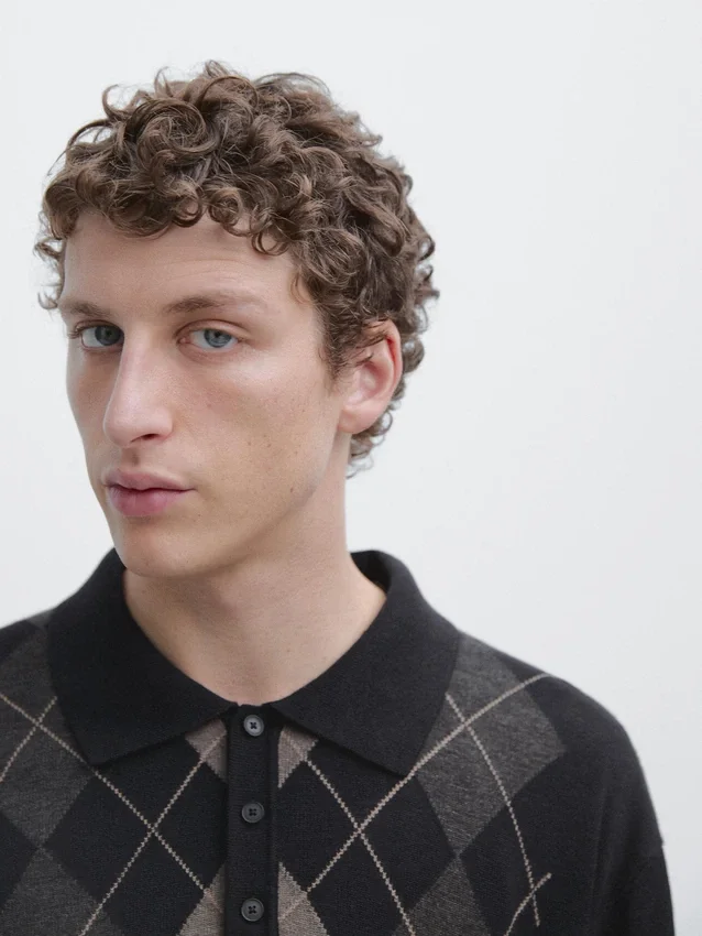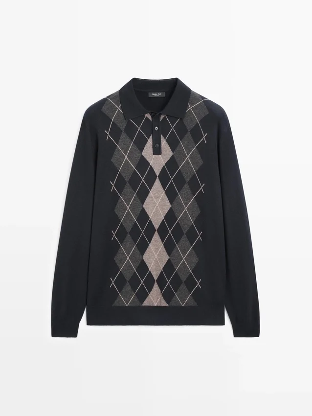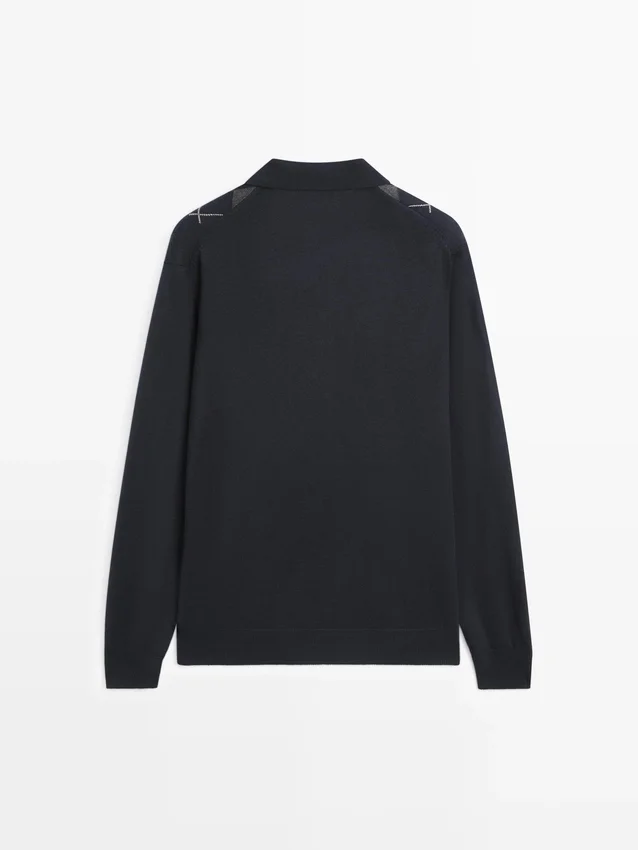 Gebreide trui van wolmix. Lange mouwen. Detail van geribde manchetten. Polo’s met knoopsluiting. Diamantpatroon.