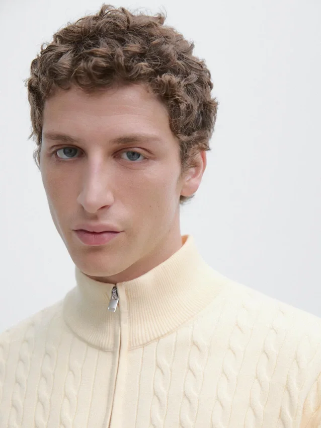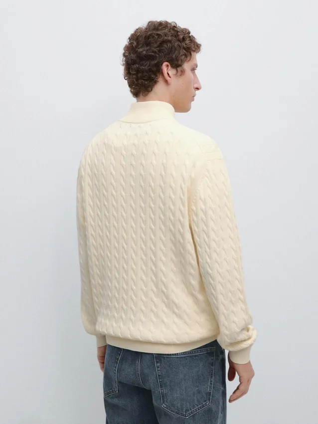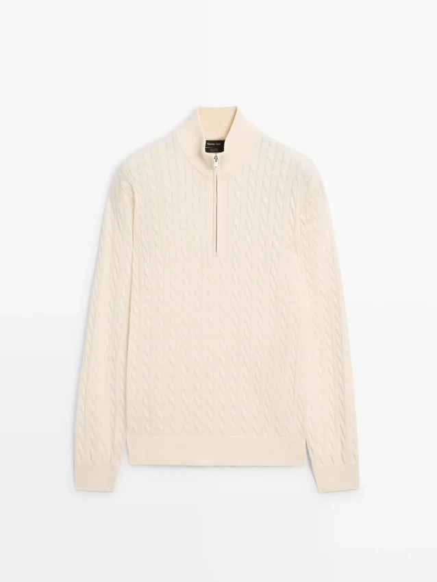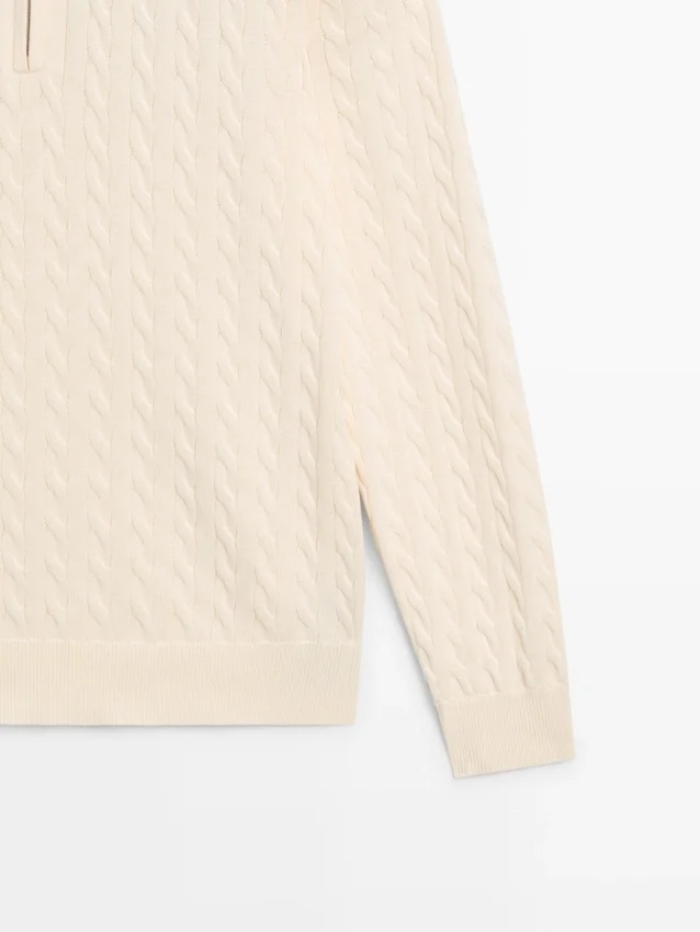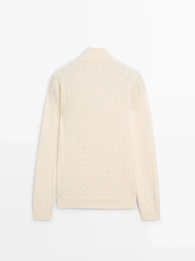 Gebreide trui van katoen. Lange mouwen. Opstaande kraag met rits. Geribde boorden. Gevlochten detail.