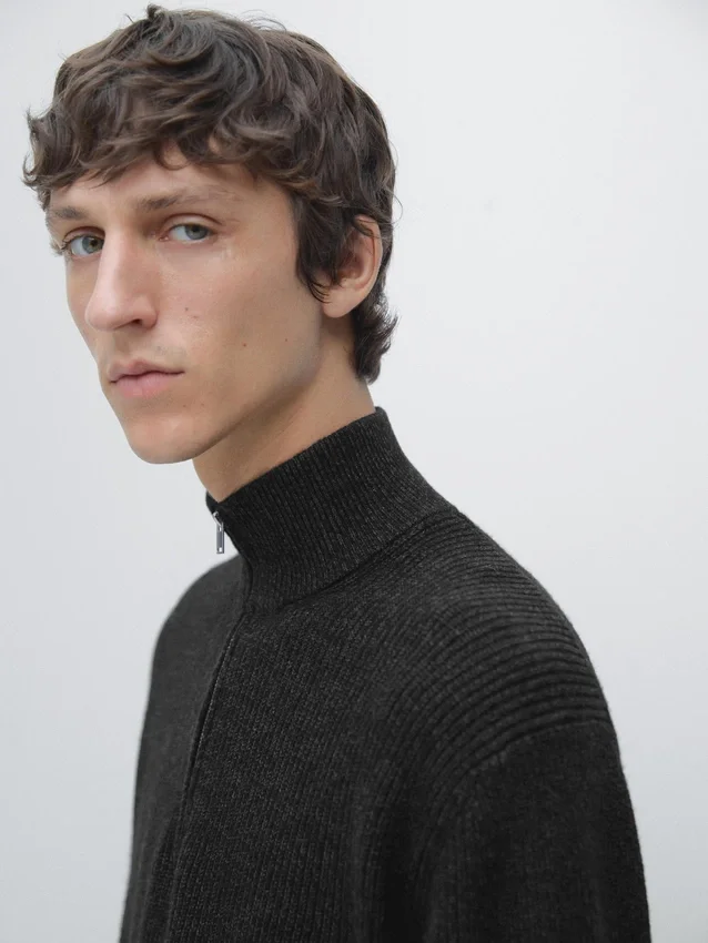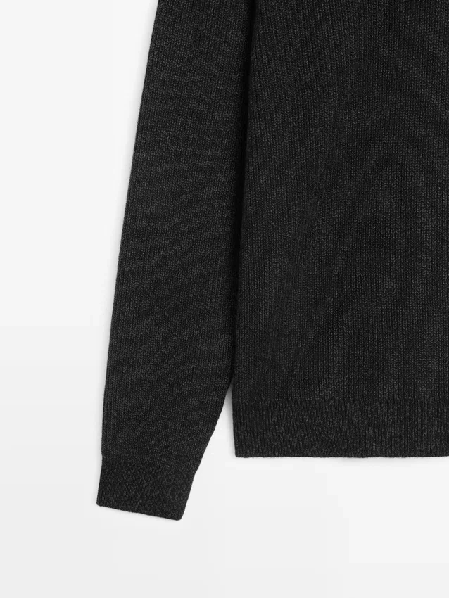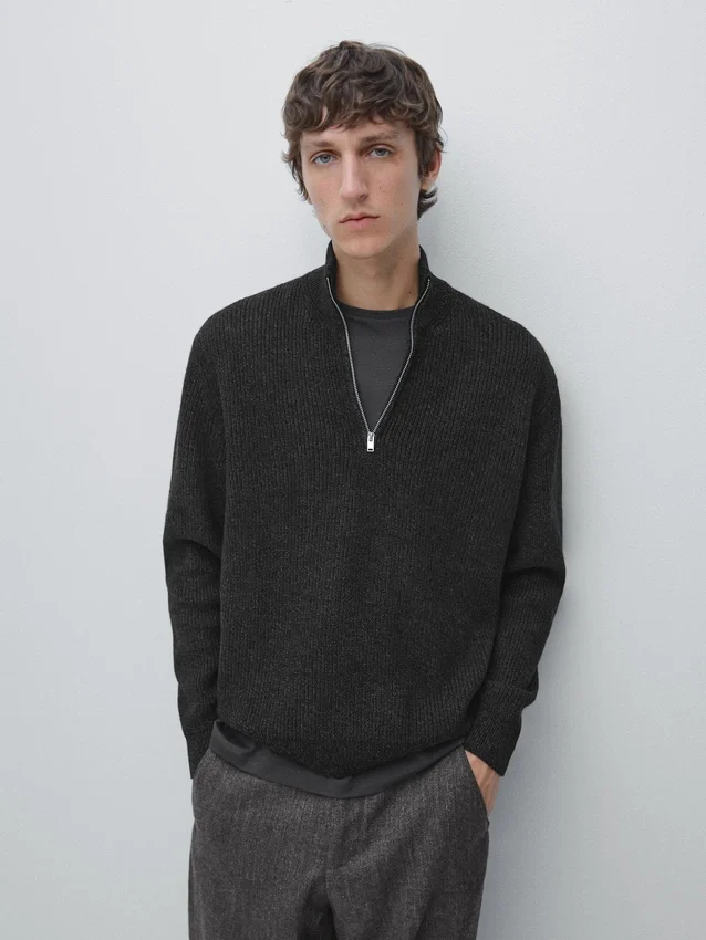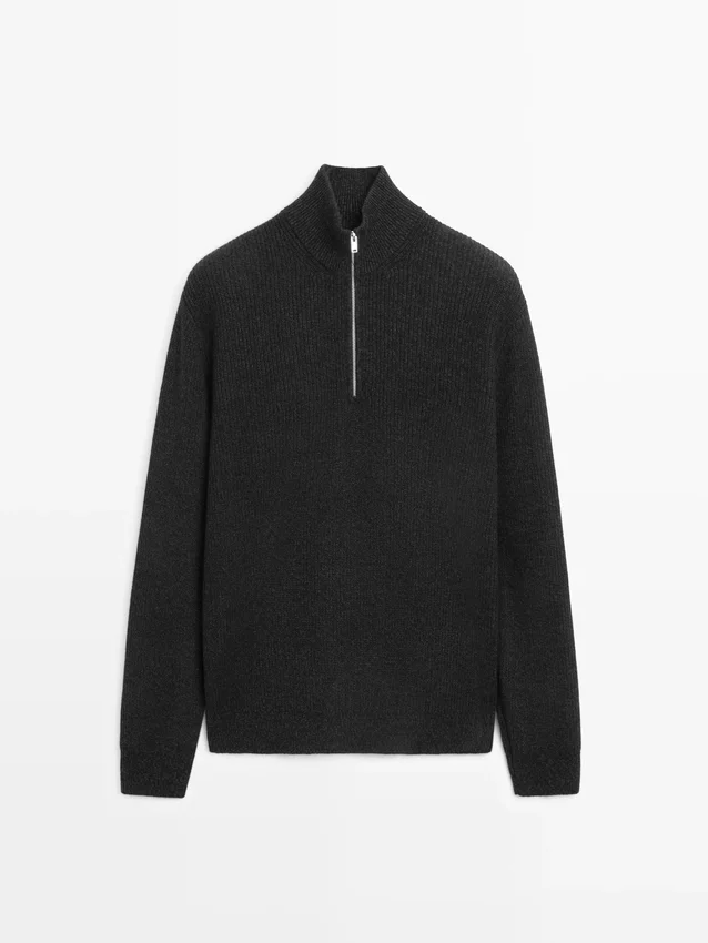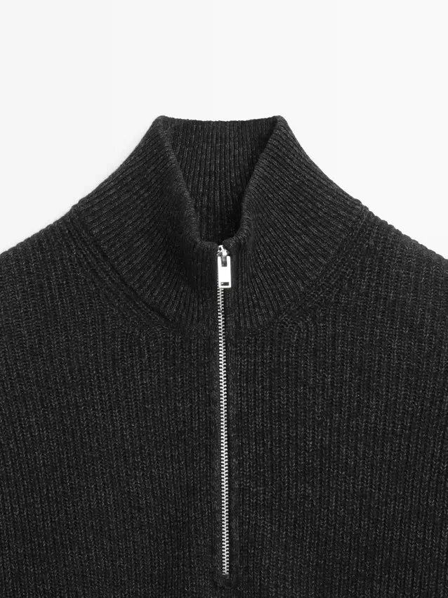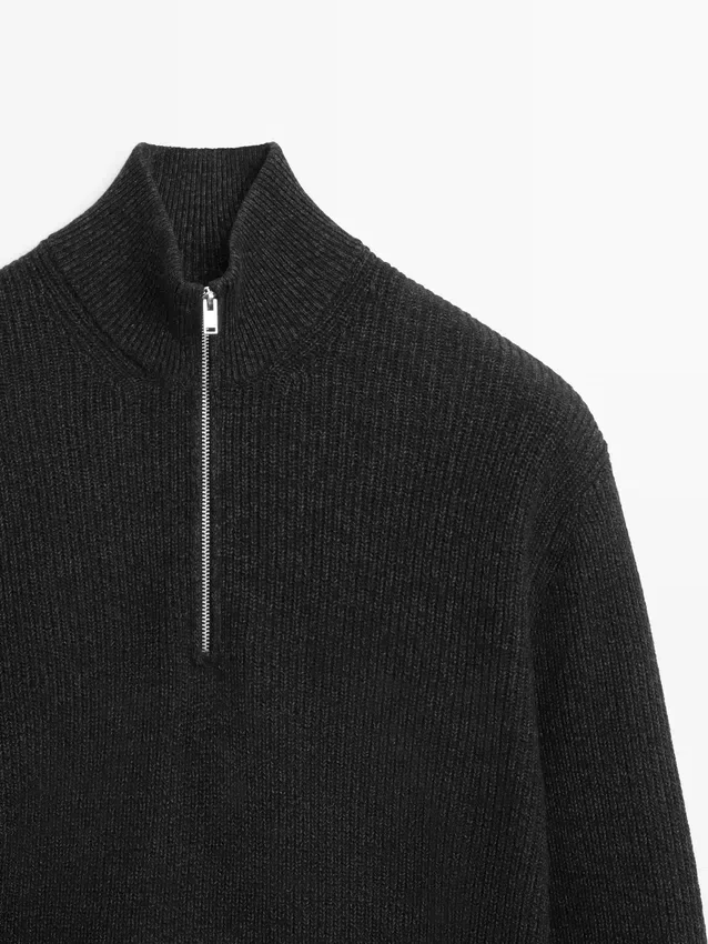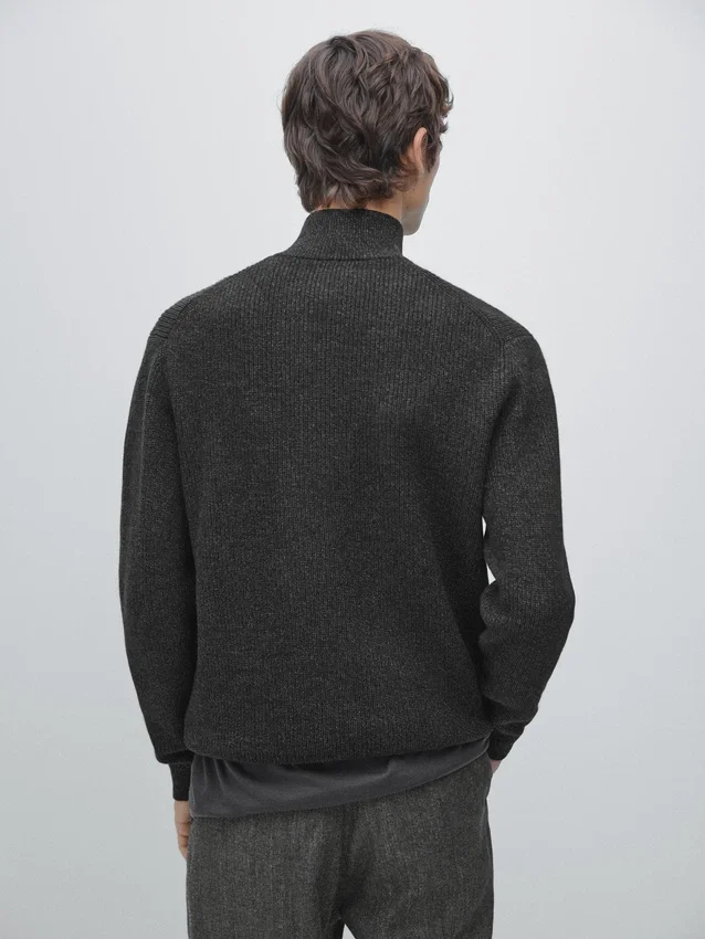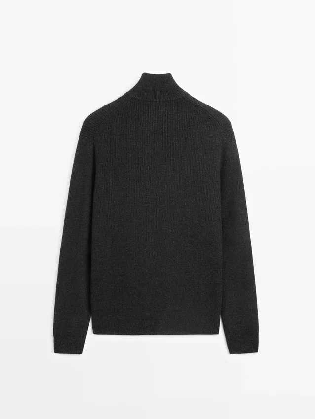 Trui gemaakt van gebreide stof met katoen en wol. Lange mouwen. Opstaande kraag met rits. Geribde boorden.Samenstelling