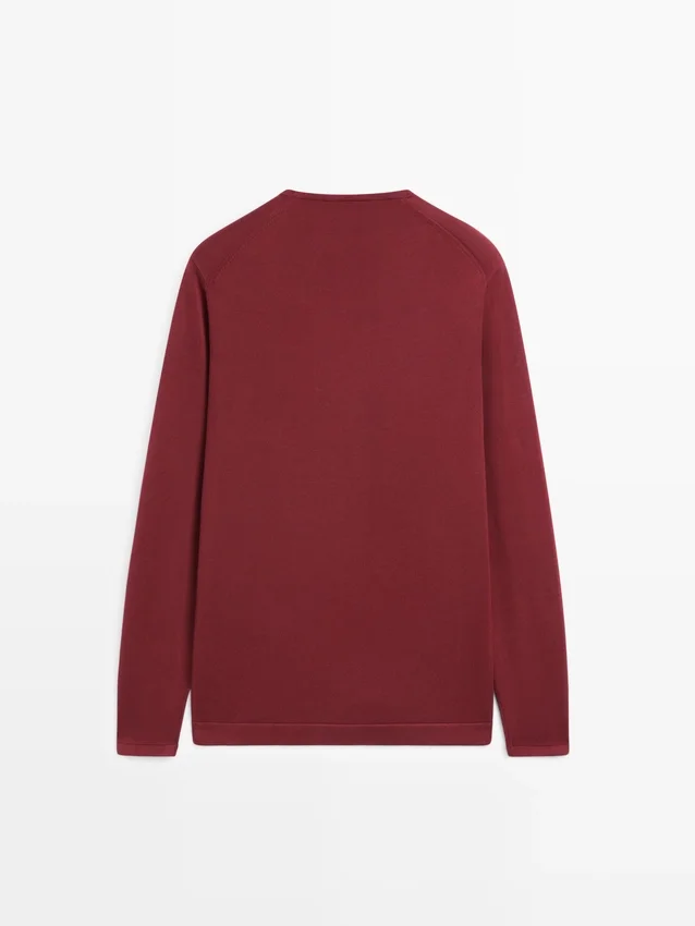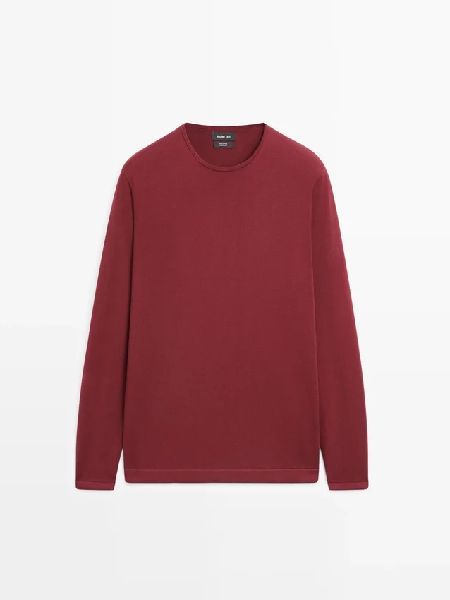 Fijn gebreide trui van 100% katoen. Ronde hals. Lange mouwen. Geribde boorden.
