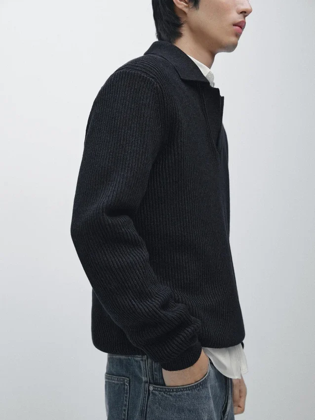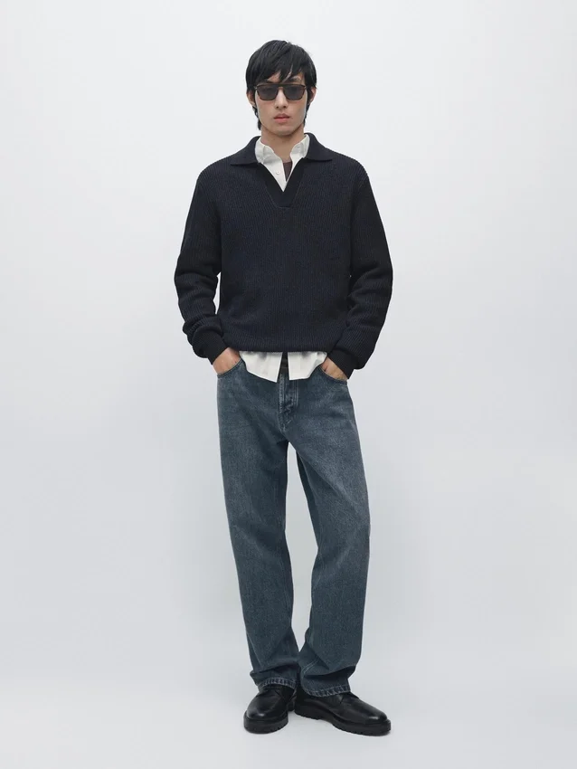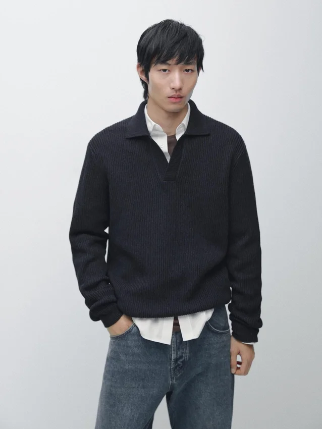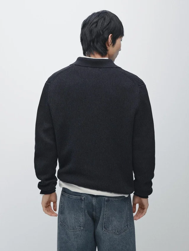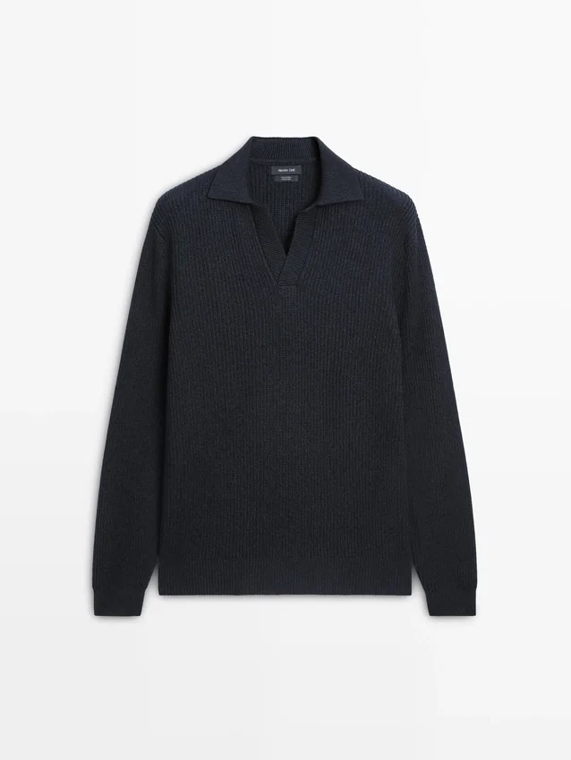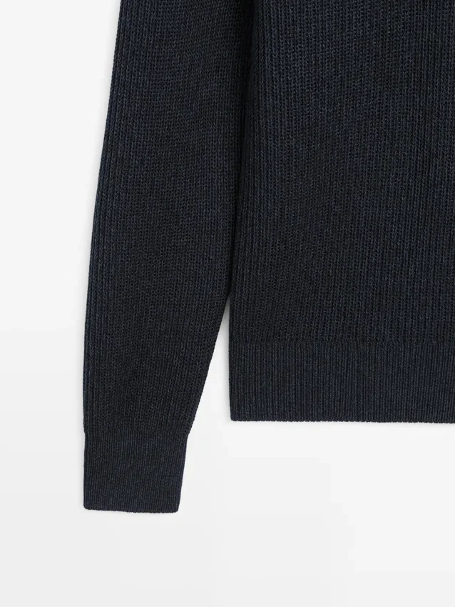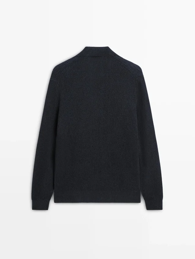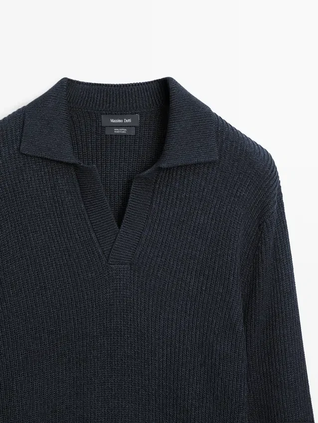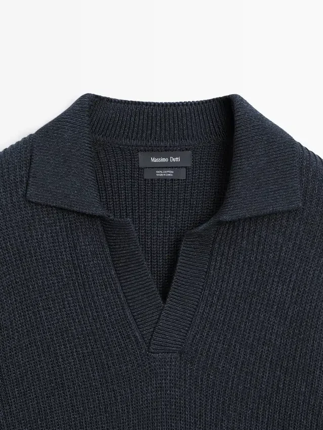 Gebreide trui van katoen. Johnny-kraag. Lange mouwen. Geribde boorden. Gemaakt van Moulina-garen dat zorgt voor een zeer karakteristiek tweekleurig uiterlijk..Samenstelling