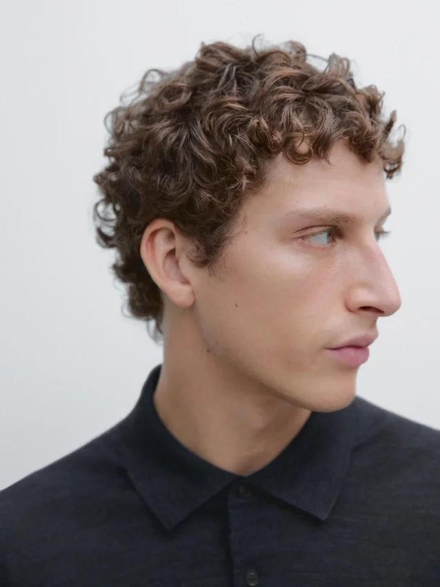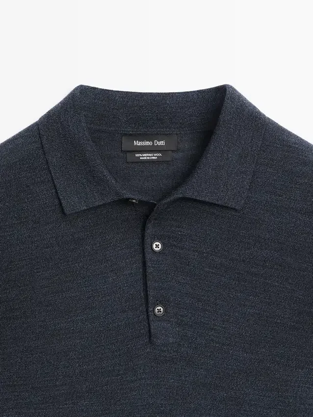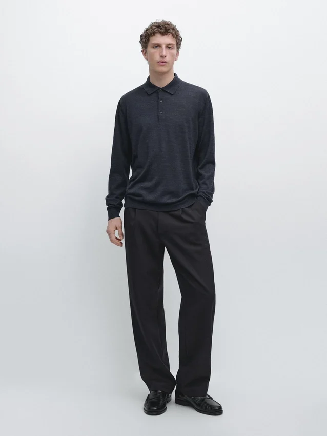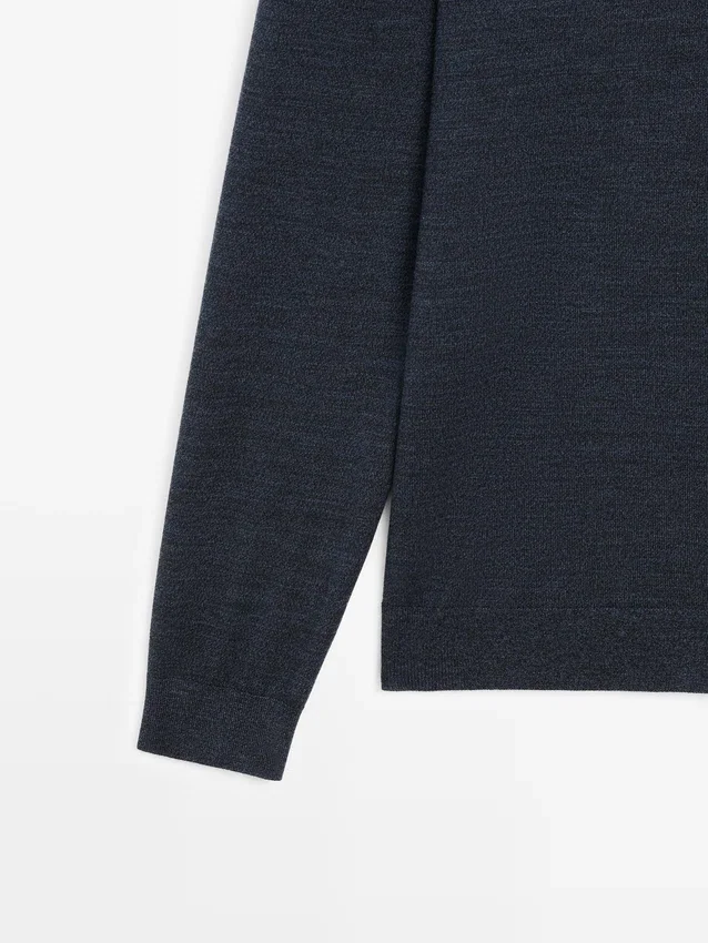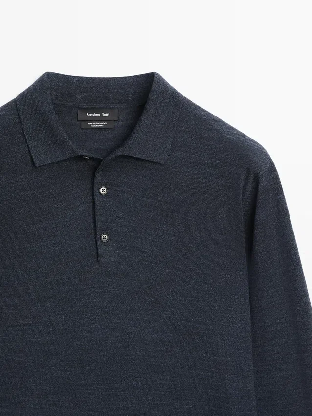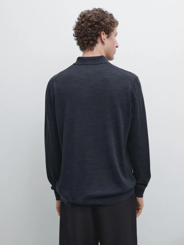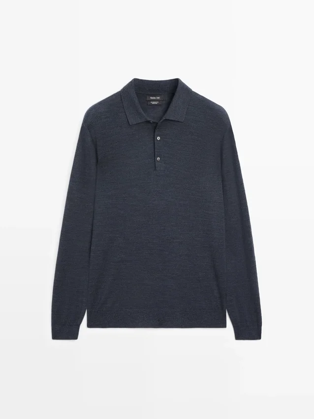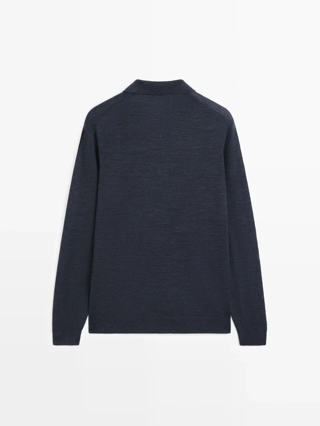 Wollen gebreide trui. Lange mouwen. Polokraag met knoopsluiting. Geribde boorden.